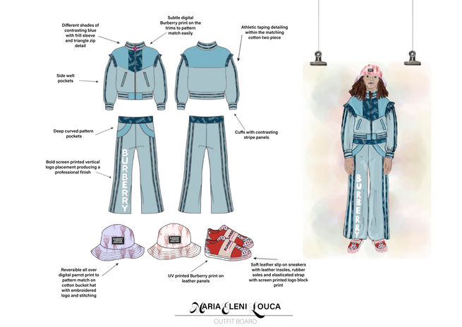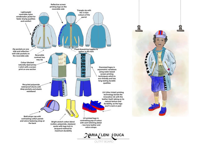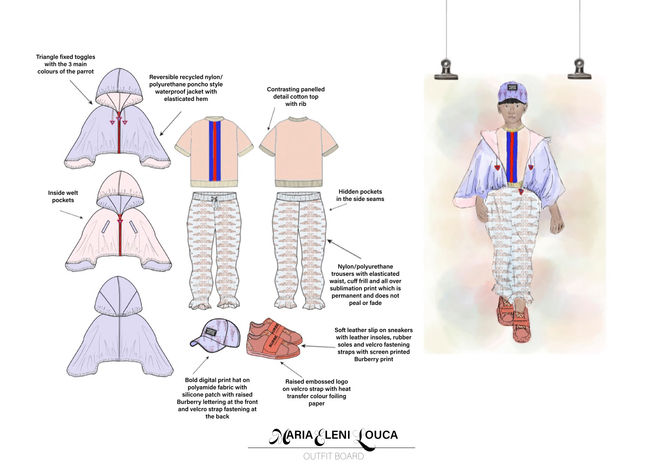 Looking at the theme, ‘Burberry Animal Kingdom’ I was drawn to tropical birds, mainly parrots, as they are brightly coloured and one of the most intelligent bird species. I incorporated some photographs that I have captured on my travels, where I have come across a range of wildlife, some of which forms the basis of my design concept. I also took into account the use of sustainable fabrics, which is a very important factor to me in the world of design. Parrots are known for imitating human voices, which you could relate to children as they tend to repeat what they hear and learn from this, so I like the idea of the hidden association within my concept. Also, children are drawn to colour, especially primary colours, hence my decision to focus on one of the most colourful birds in existence. By conducting research I identified that these primary colours, portrayed by parrots, are common of 1990s sportswear, therefore I focused on activewear / athleisure wear. Designing garments that can be worn in different settings, such as, athletic activities, casual or social occasions or even at school, allowing sportswear to be more versatile, comfortable and fashionable. This also plays to my love of keeping fit and healthy.